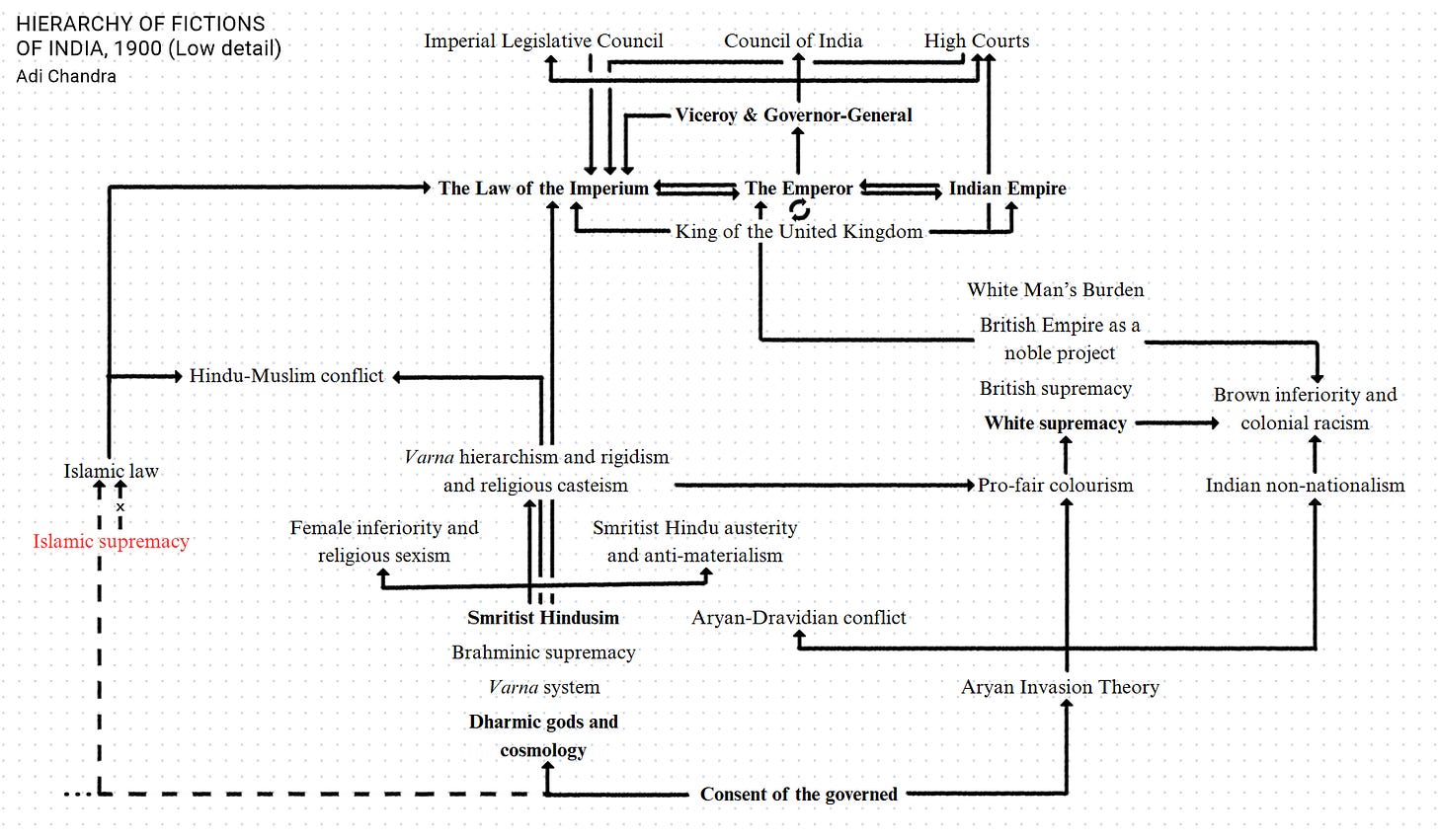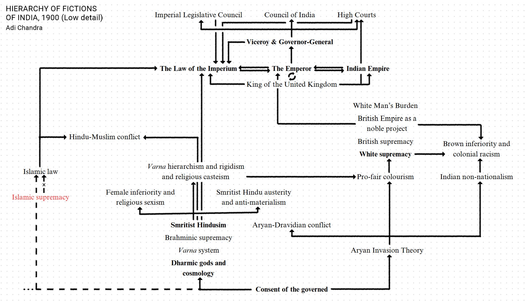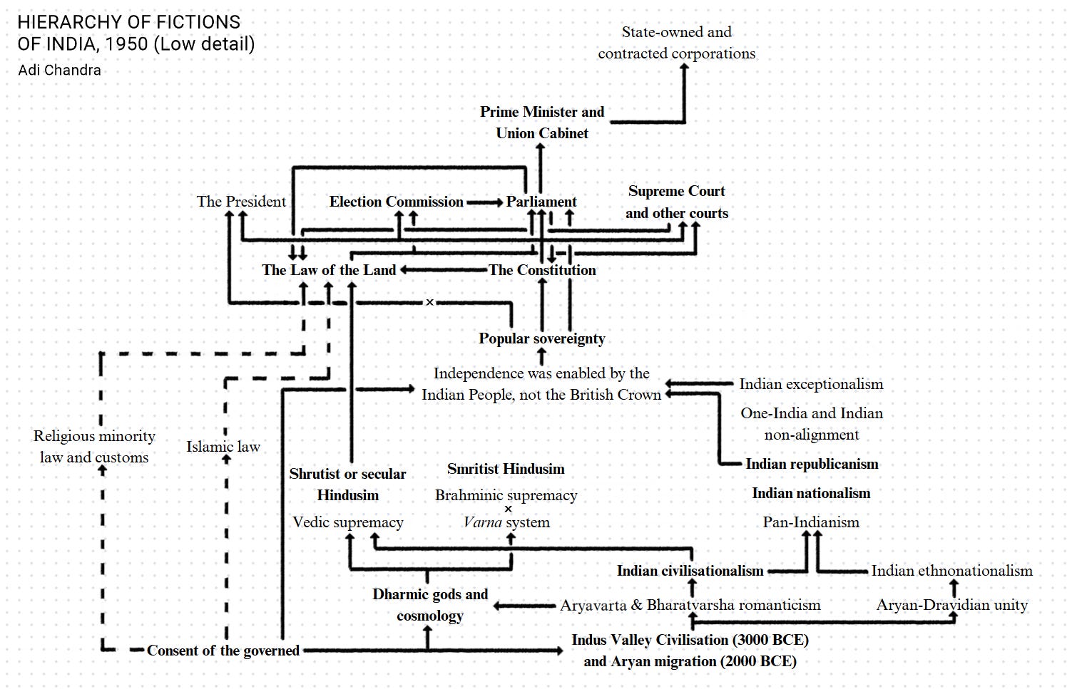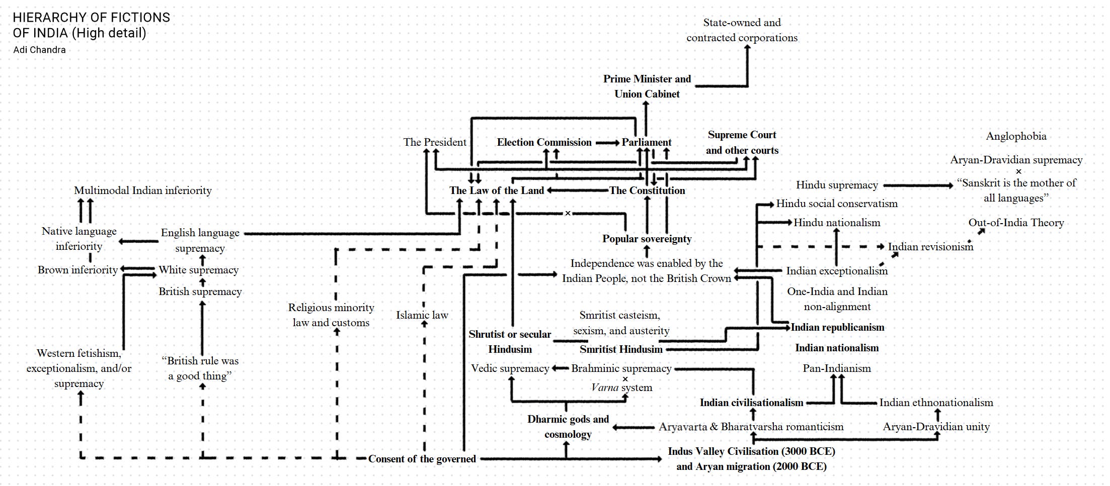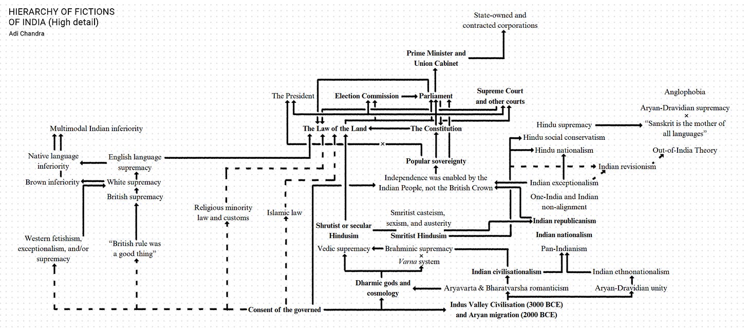 Put very simply, the first many fictions described above are the upper fictions of this part of the hierarchy in Country X, while the last few fictions, which are notably increasingly ontological, are the lower fictions. These fictions are not all strictly lies per se, and can be legal, historical, mythological, metaphysical, ethical, scientific, pseudoscientific, or of any other type. Despite how I have illustrated the concept above, a hierarchy of fictions of a social group is not linear in structure, but is rather a complex and variable web in which most fictions each connect to multiple other fictions. Given below, for instance, is my attempt at drawing the present-day hierarchy of fictions that makes up the Indian state: