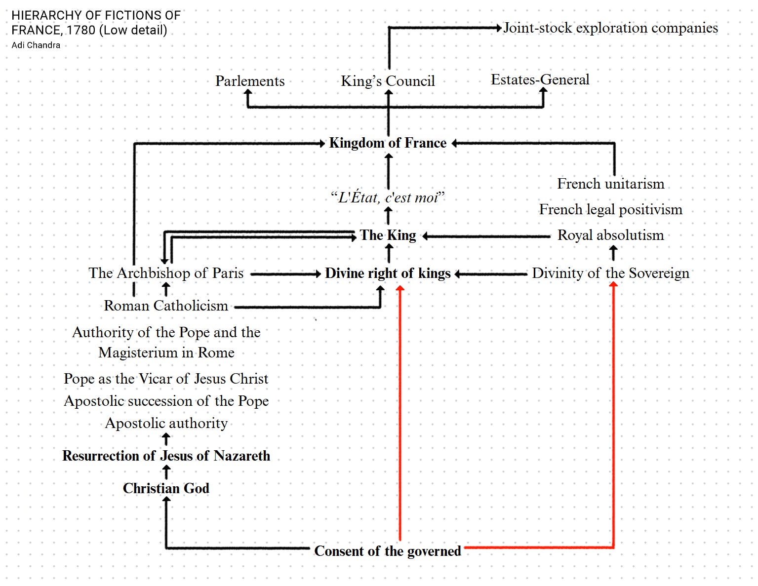 As this understructure is removed on the eve of the French Revolution, the hierarchy of fictions of France tips to one side and the King as an absolute monarch loses the vast majority of his legitimacy, directly causing the state and its institutions—the government, the courts, and the estate system—to lose most of their legitimacy as well.