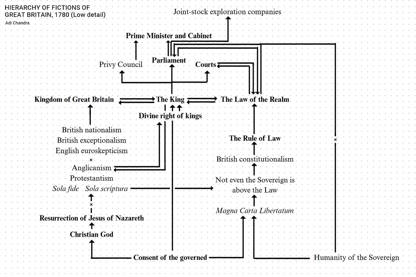 A stable hierarchy of fictions has, firstly, legitimacy, meaning the connections between the fictions are strong, durable, and grounded in robust lower fictions that can support the structure in-perpetuity. The hierarchies of fictions observed in today’s enduring hierarchies are both highly vigorous and secured by such inviolable and venerated institutions as the monarchy of the UK and the Constitution of the US.